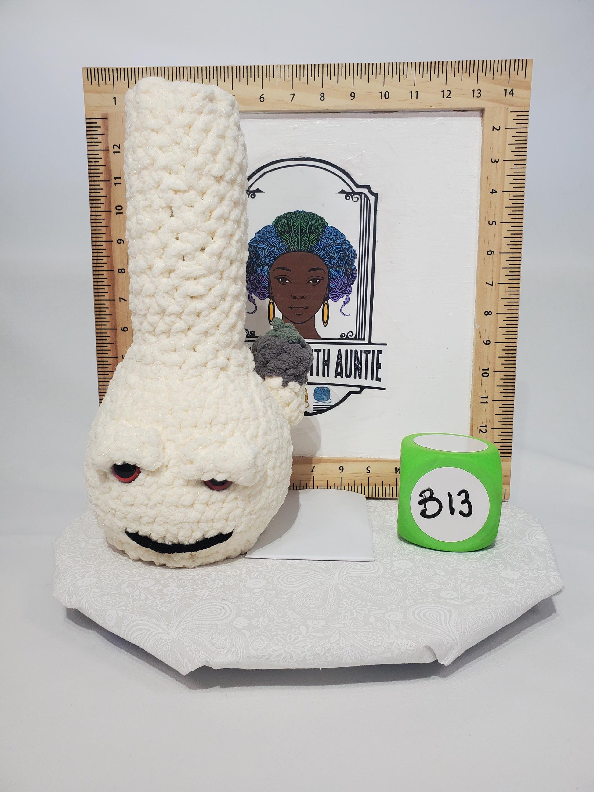B13: Crochet Bong, Sparkle White, made with 100% polyester, soft blanket yarn, and safety eyes, approx. 12" x 5", 11 oz