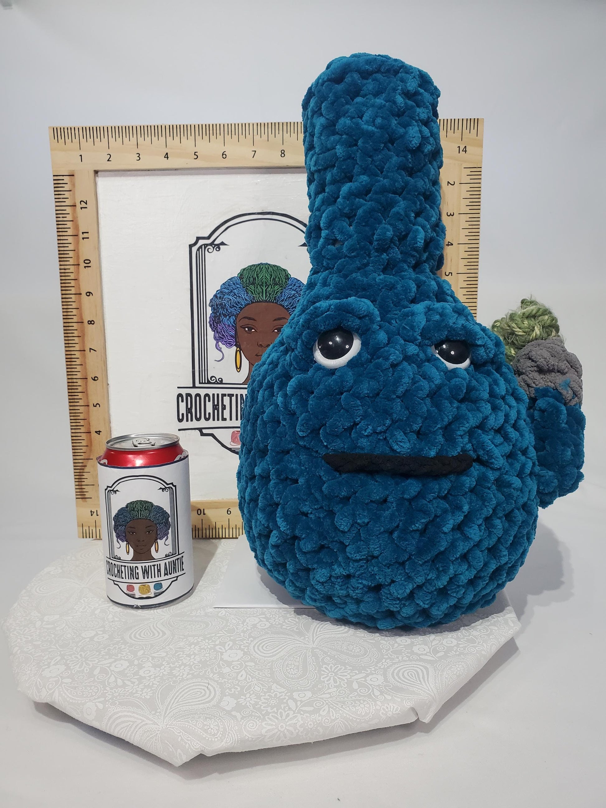B18: Crochet Bong, Teal, made with 100% polyester soft blanket yarn and safety eyes, approx. 17" x 10", 1 lb 5 oz