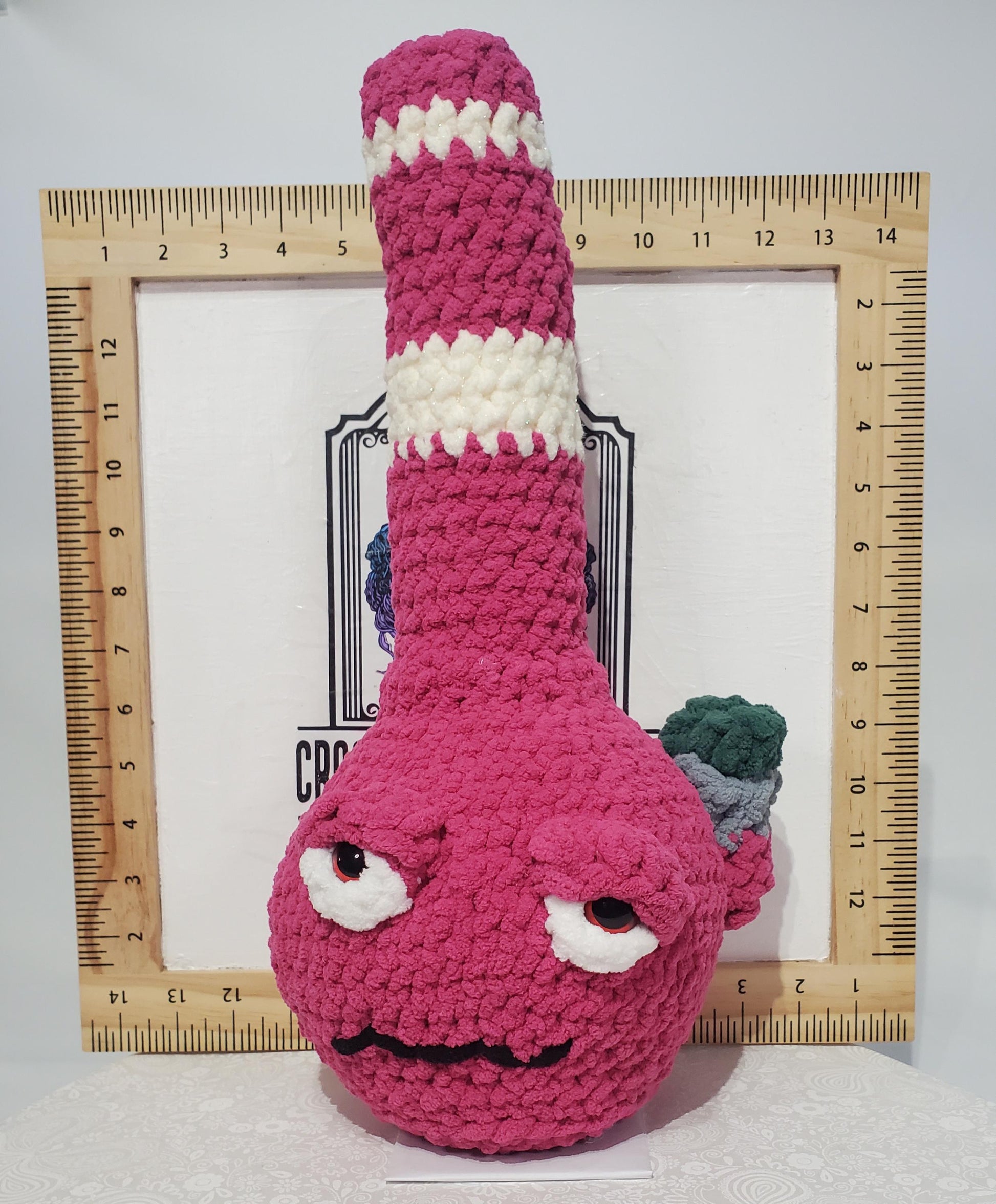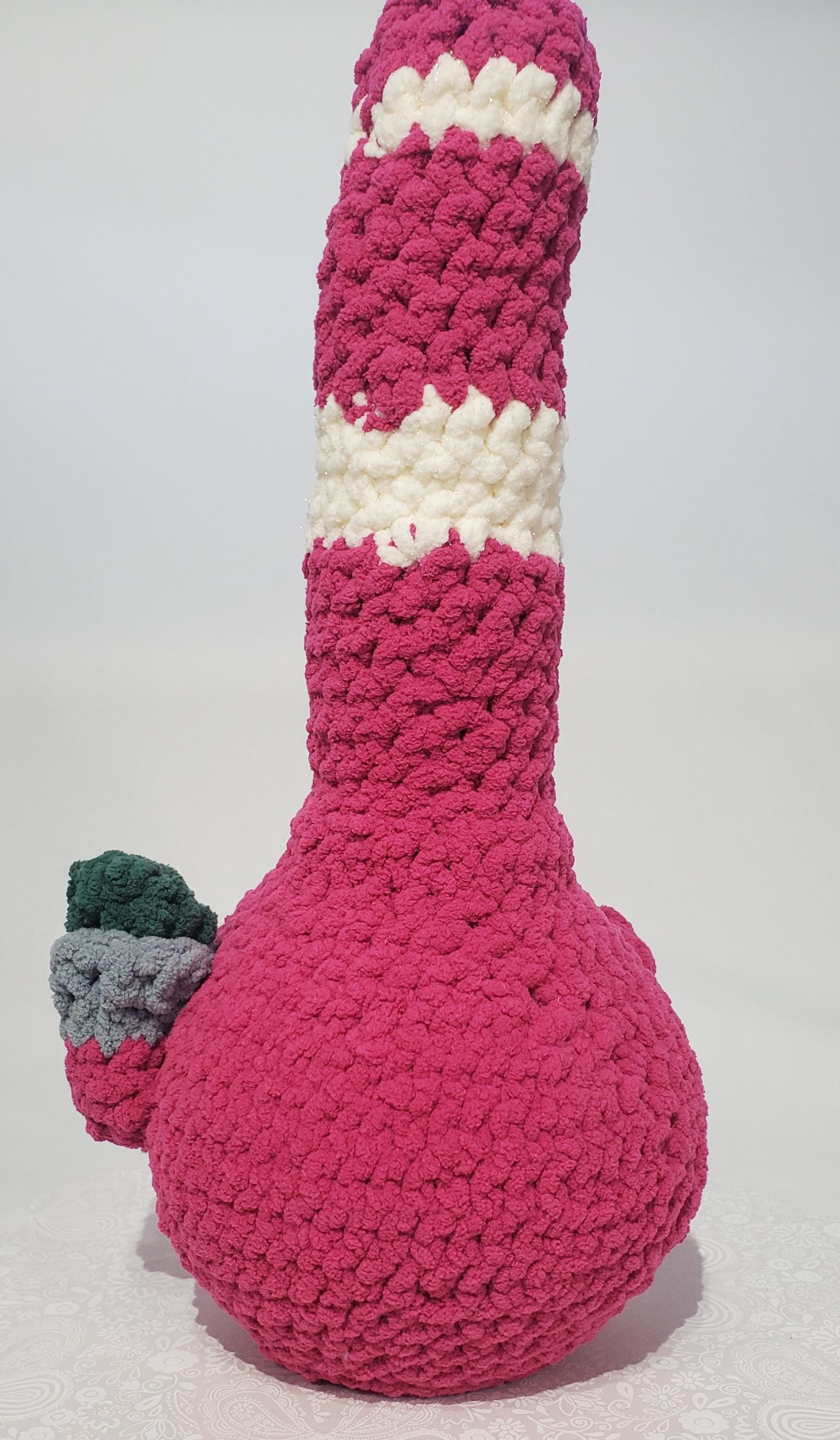 Crochet Bong, Pink and white, made with 100% polyester, soft blanket yarn, and safety eyes, approx. 16" x 7", 13 oz