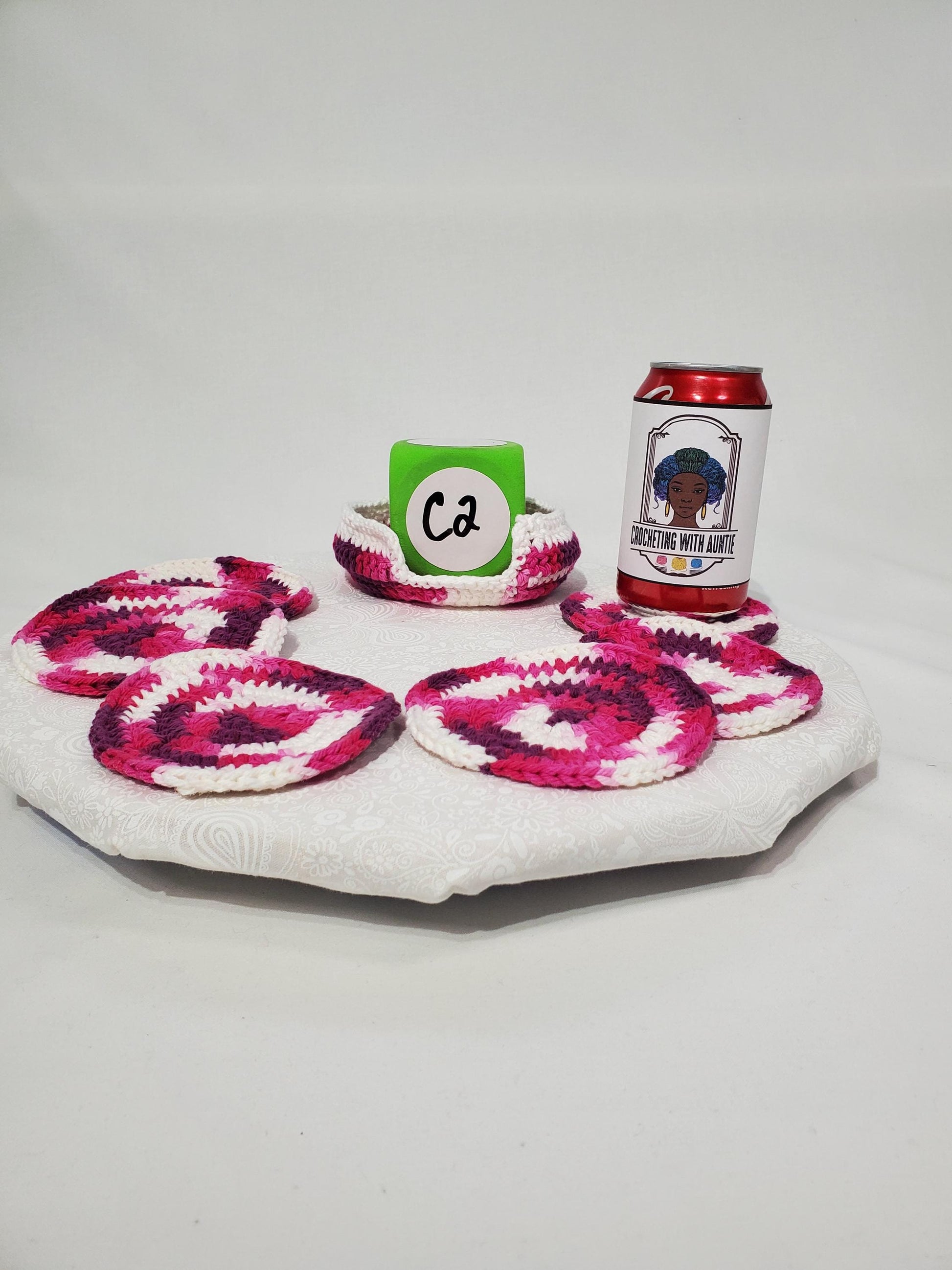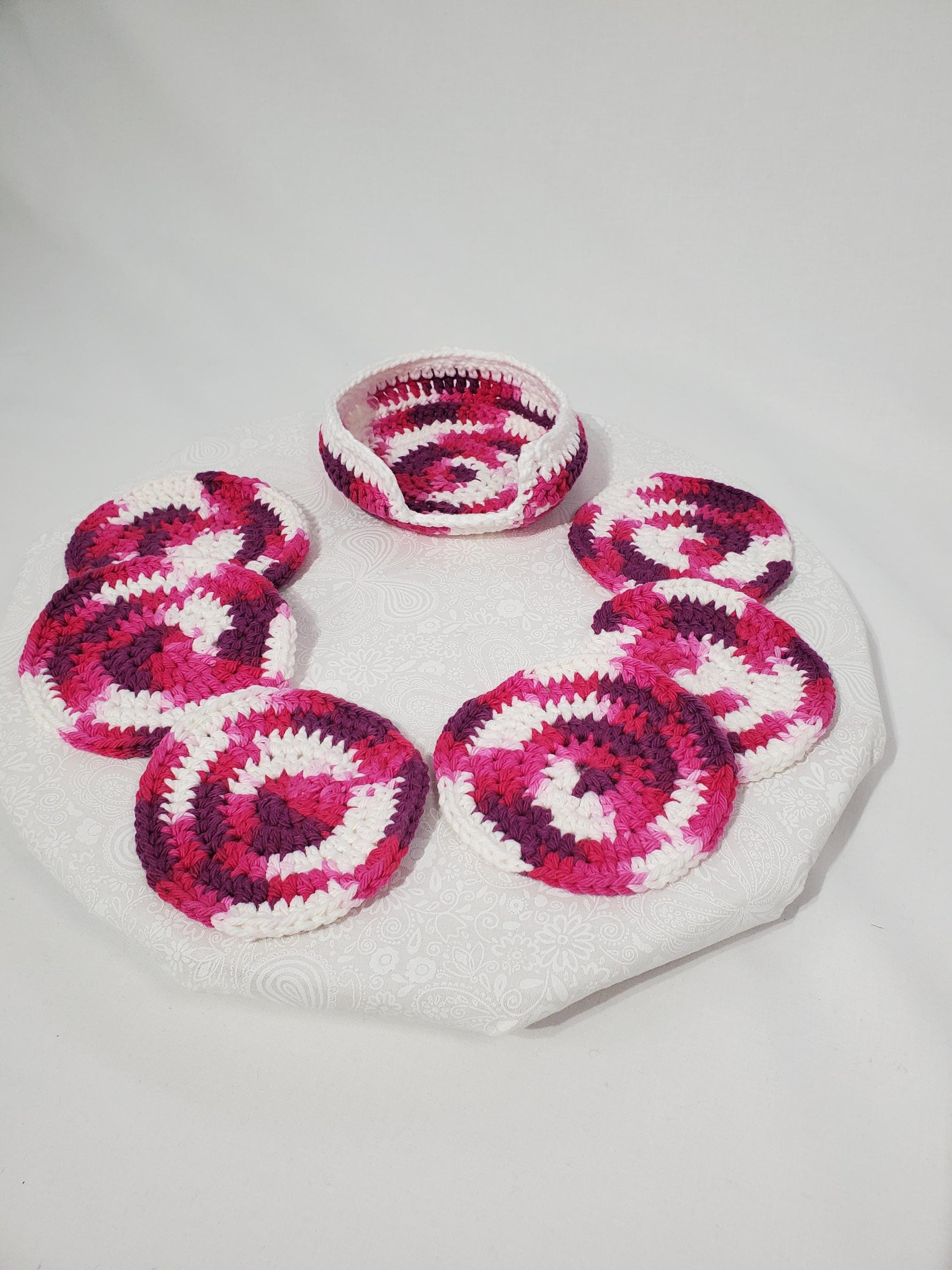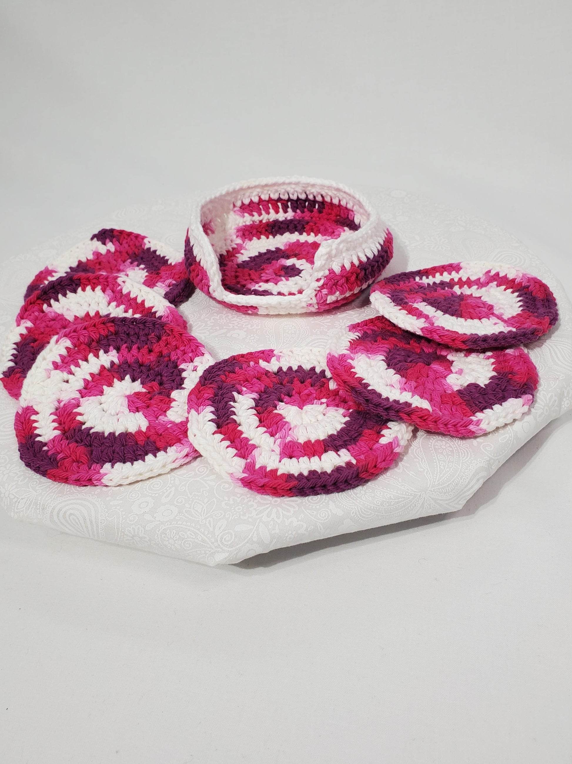 Crochet Coaster Set, Berry Swirl and White, made with cotton yarn, set of 6 with holder