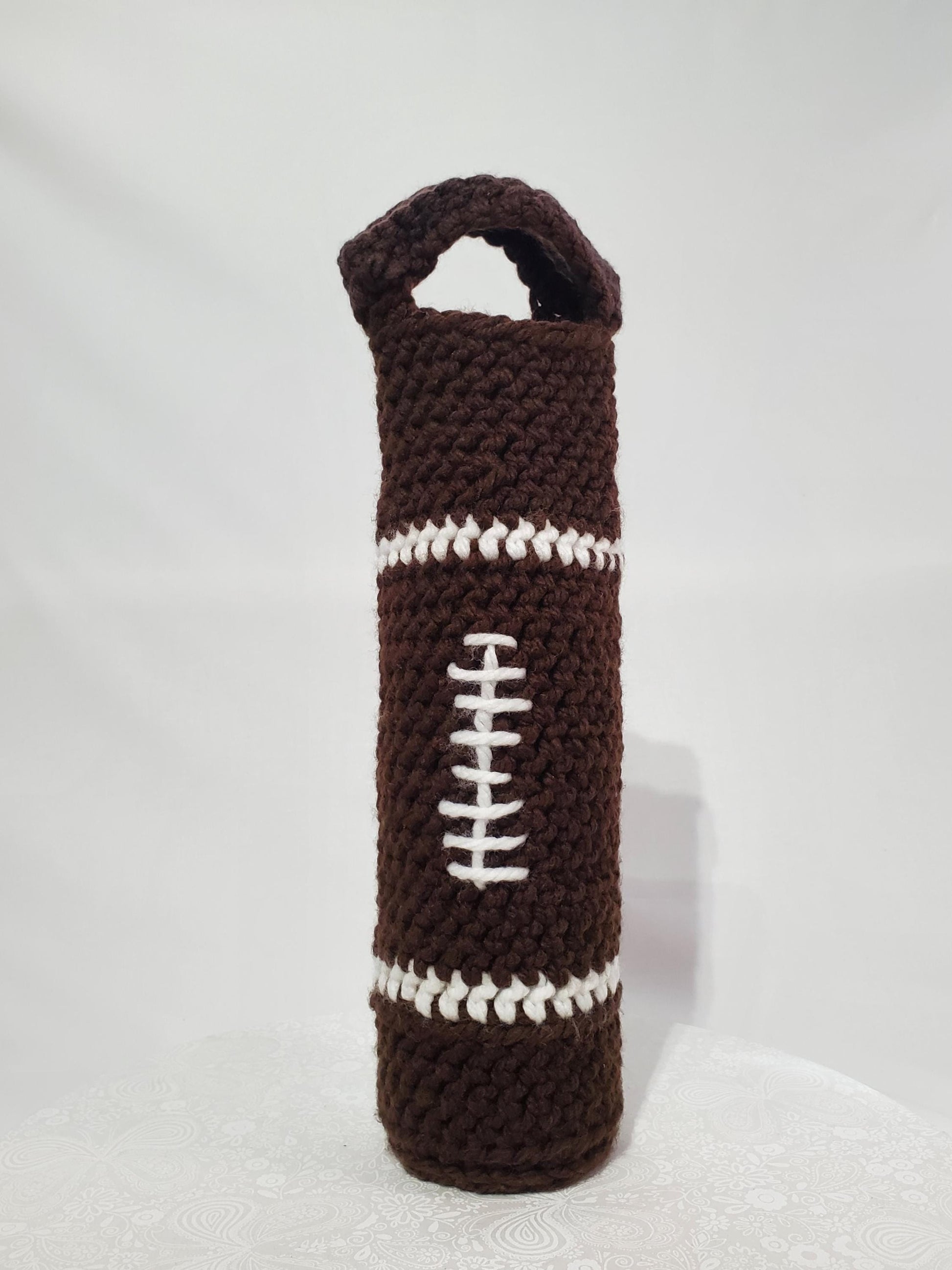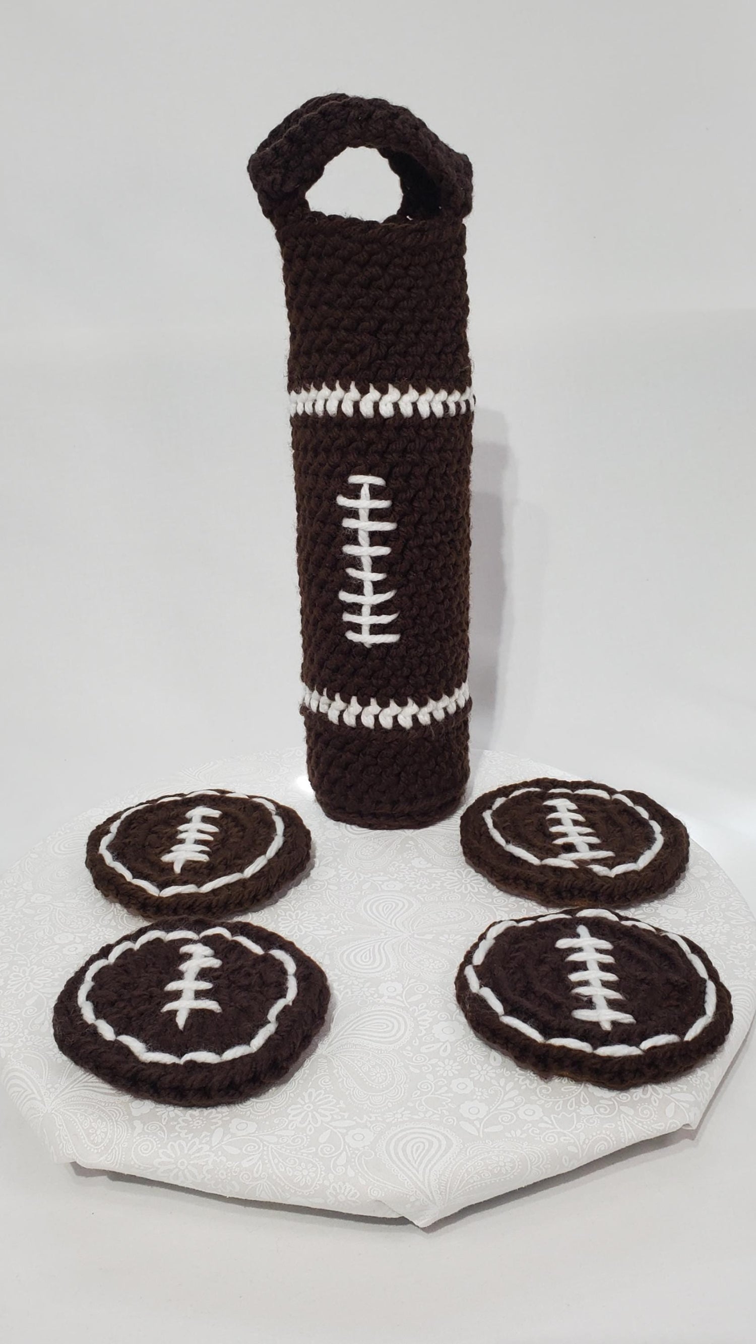 Football Wine Cozy and Coaster Set, made with acrylic yarn, coasters cork backed