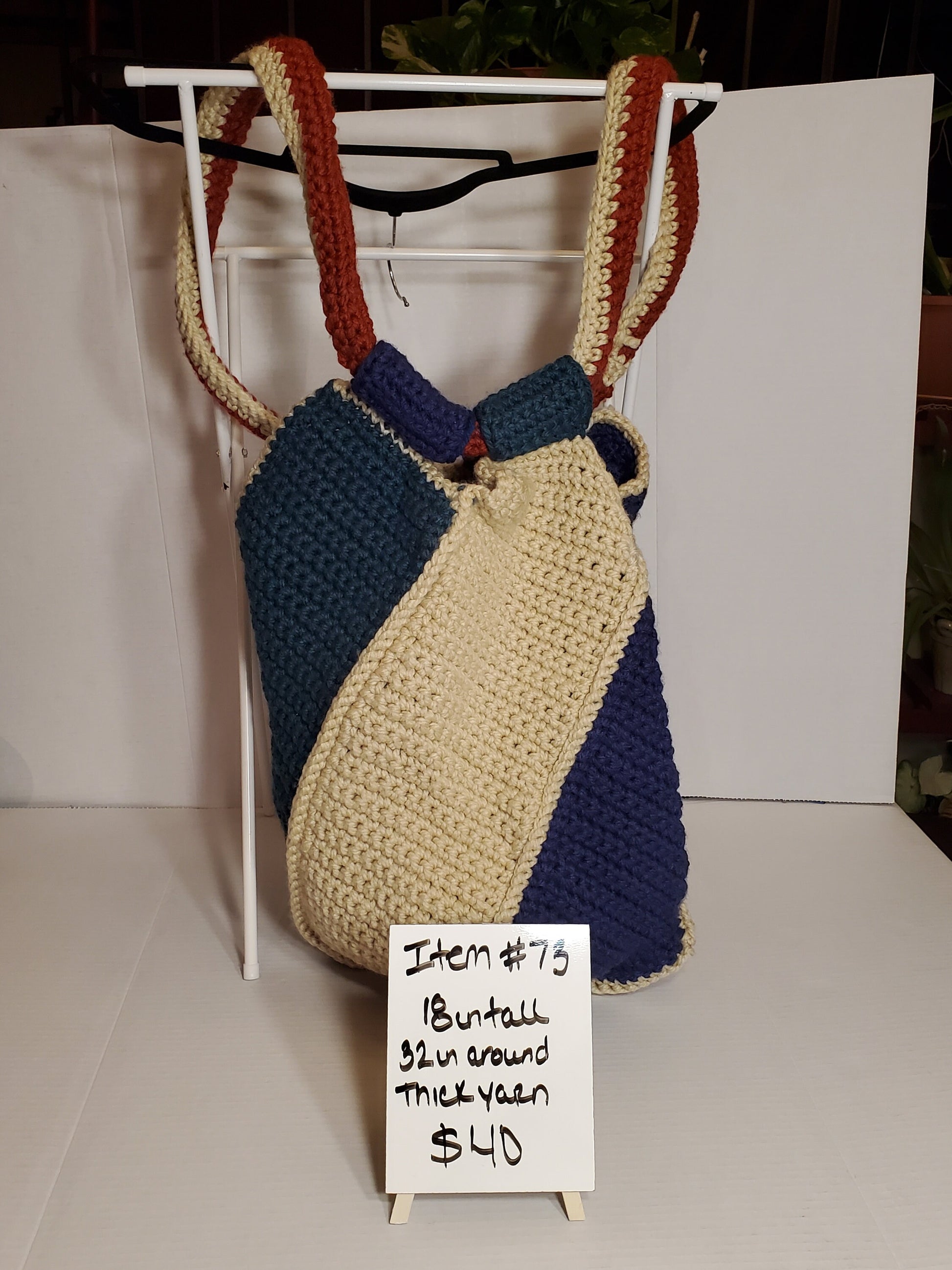 Crochet Tote, Maroon, Tan and Blue, 18" Tall 32" Around, Made With Chunky 100% Acrylic Yarn