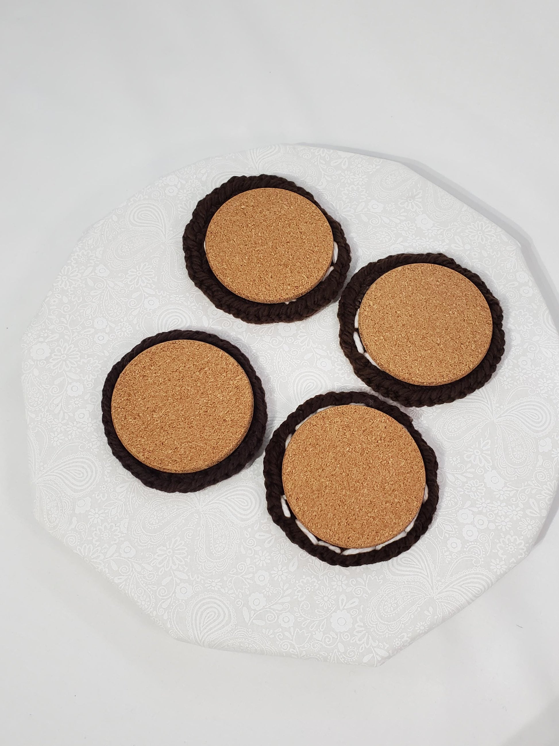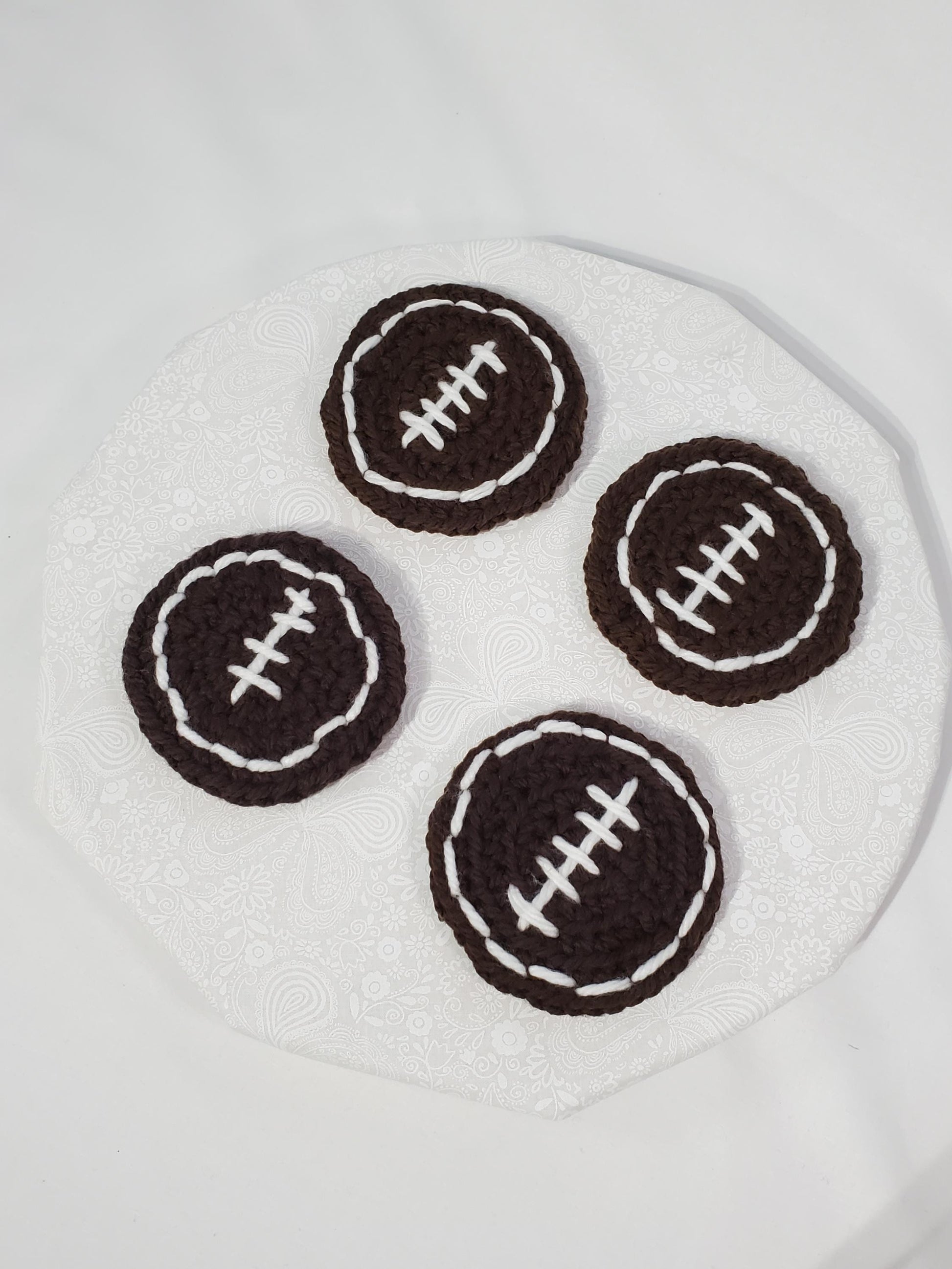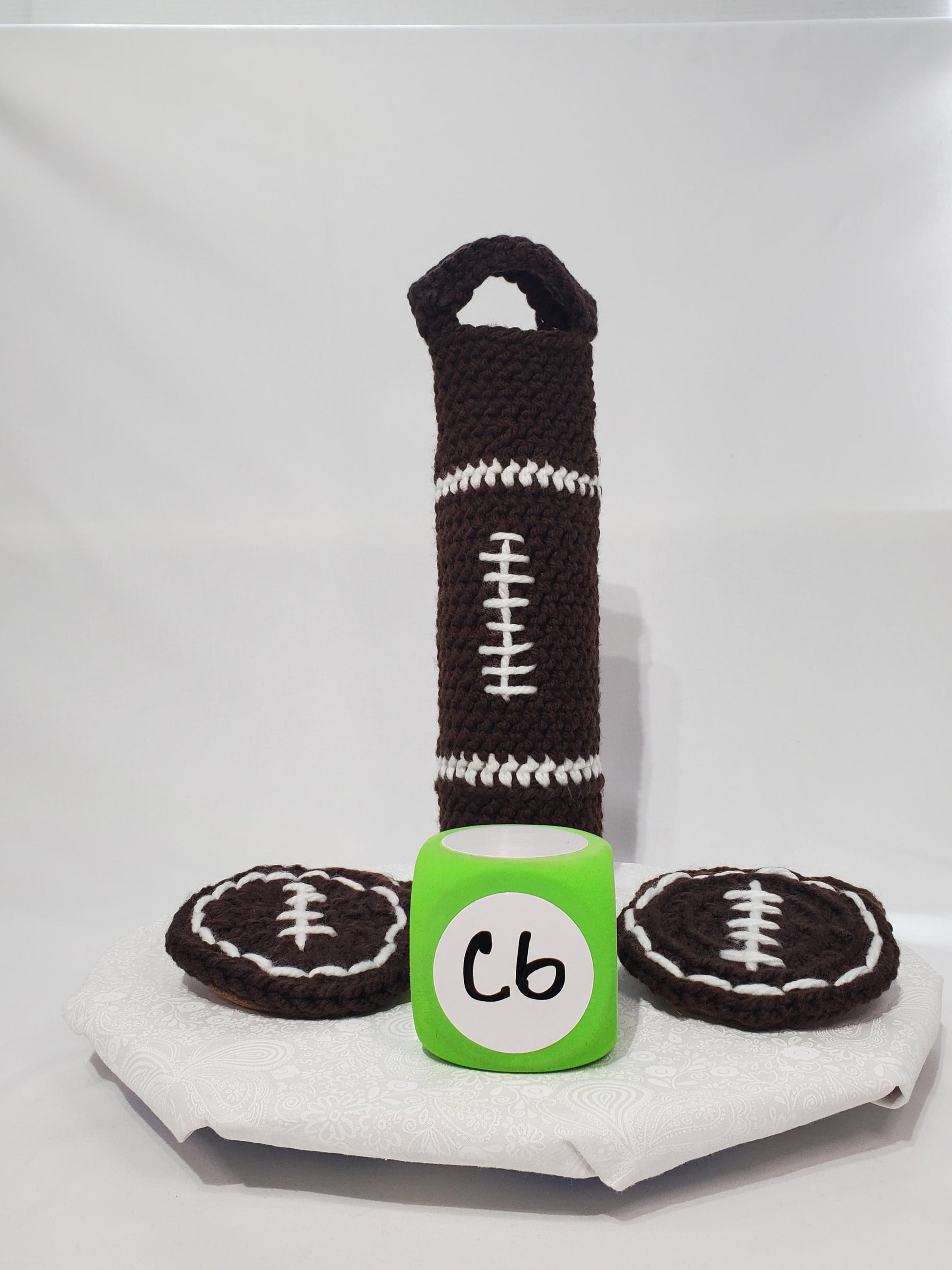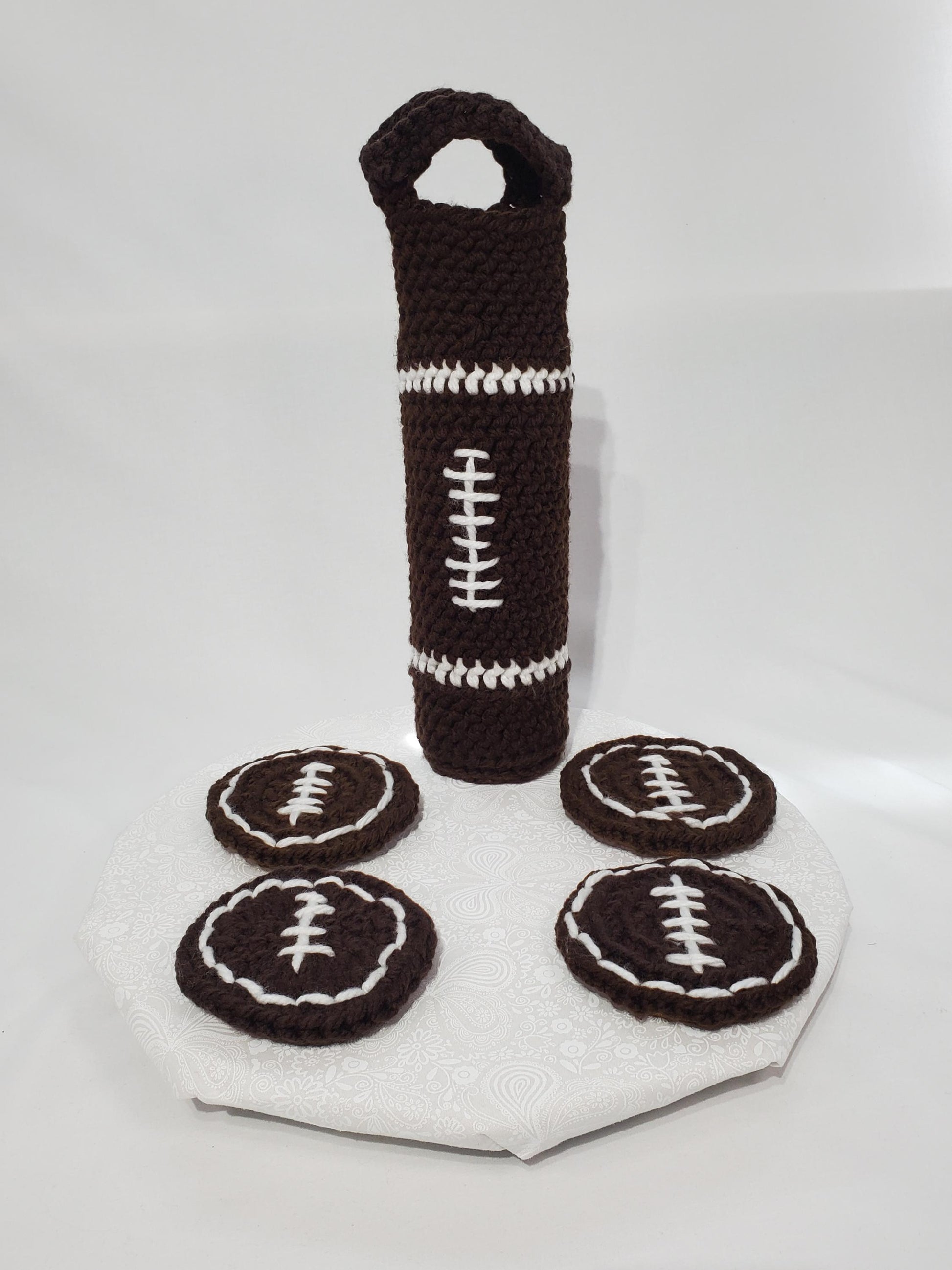 Football Wine Cozy and Coaster Set, made with acrylic yarn, coasters cork backed