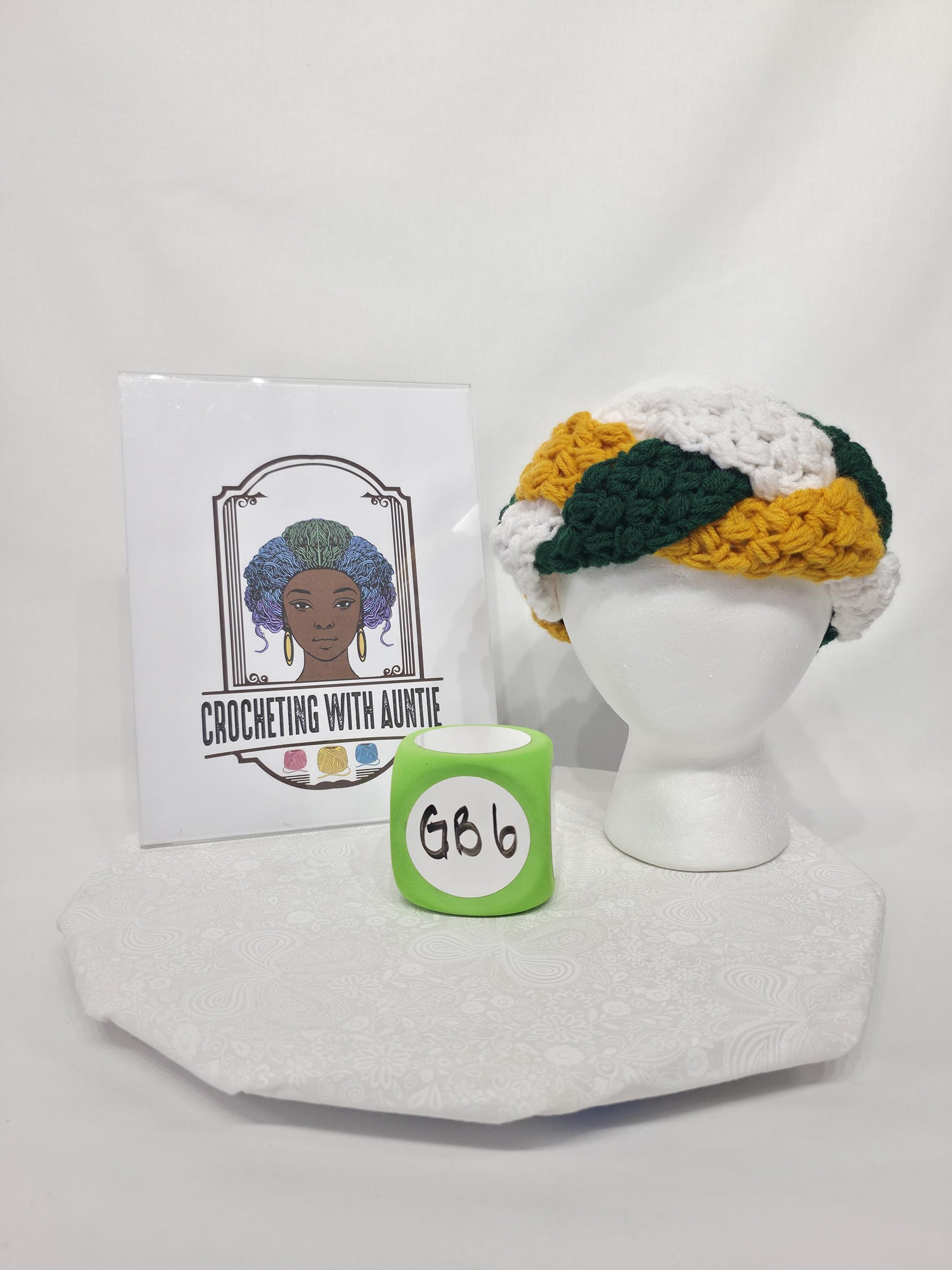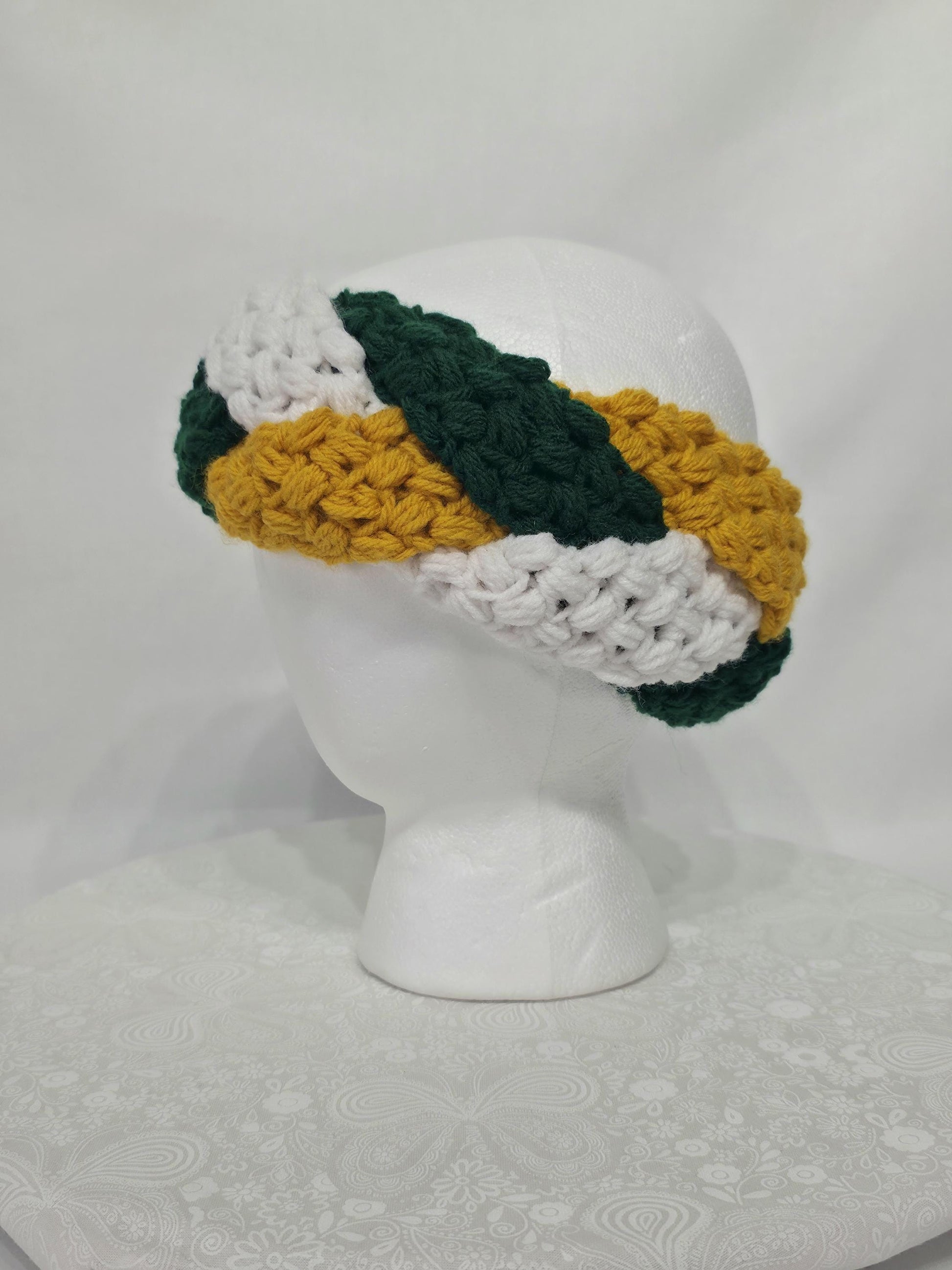 Green Bay Packers Inspired Crocheted Braided Ear Warmer, Child 4-12, made with 100% acrylic yarn.