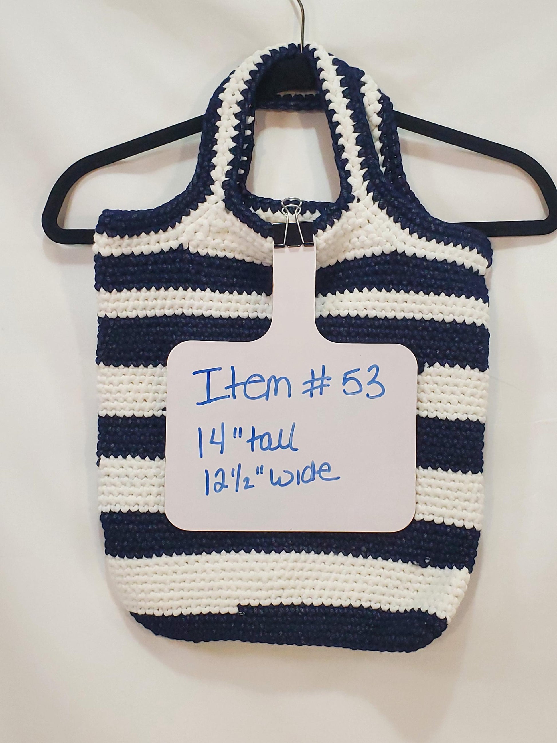 Item #53: Crochet tote, blue and white, 14" tall, 12 1/2" wide, Made with outdoor yarn - 68% acrylic/32 nylon