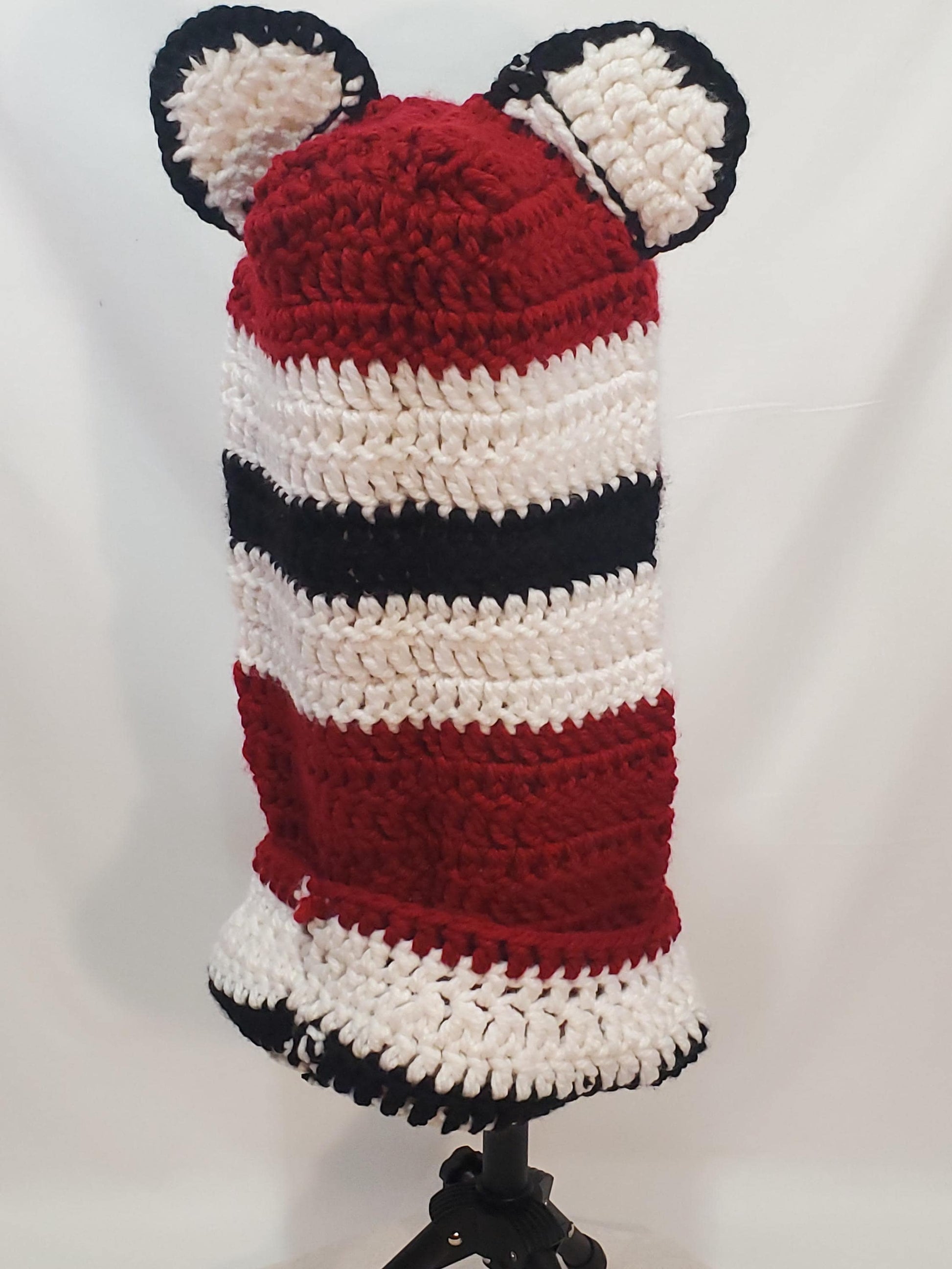 Crochet Hood/Hat, Black, White & Maroon, Adult Sized, Made With 100% Acrylic Chunky Yarn