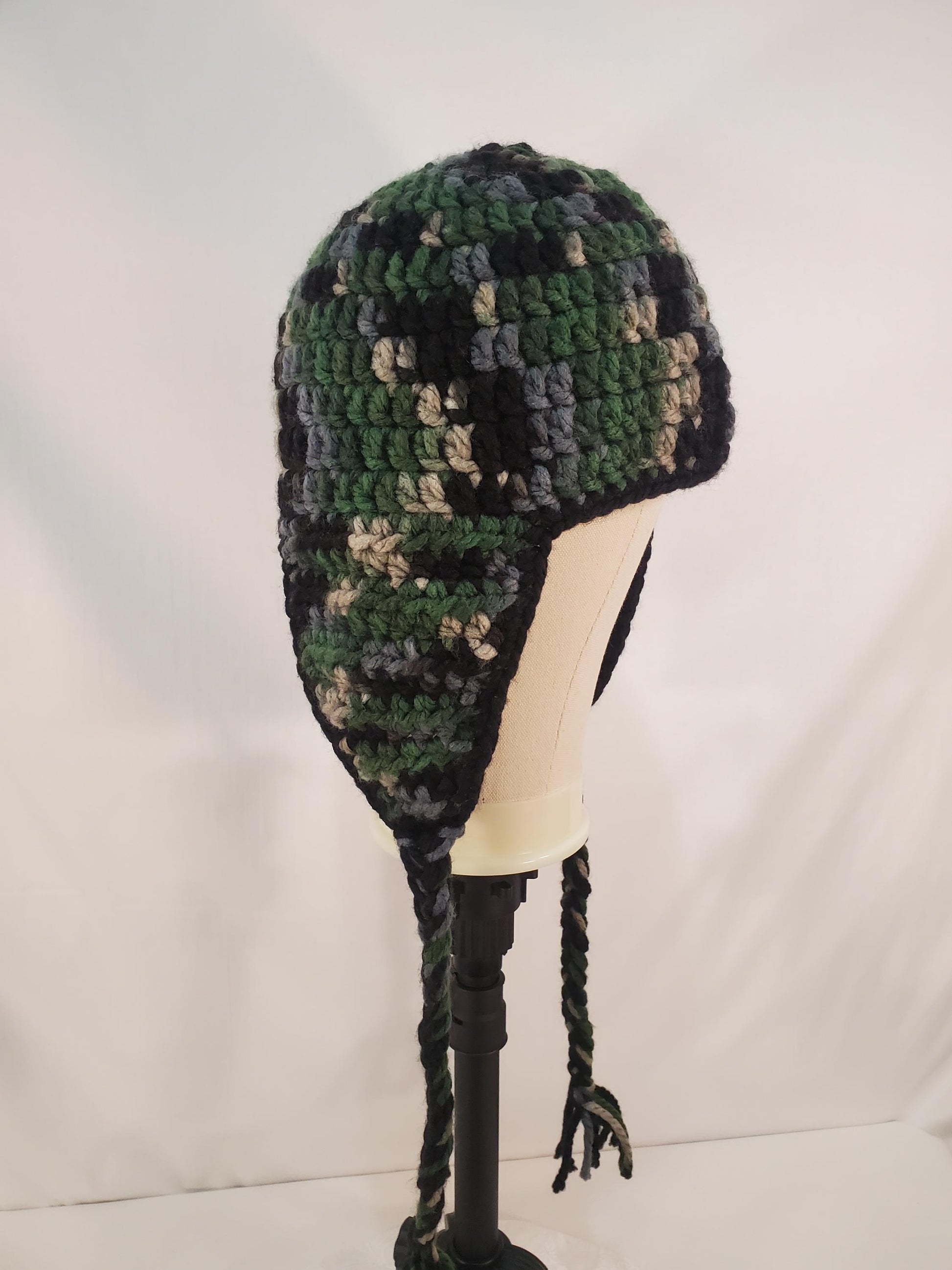 Crochet Ear Flap Hat, Camo, Child (4y-10y), Made With Chunky 100% Acrylic Yarn