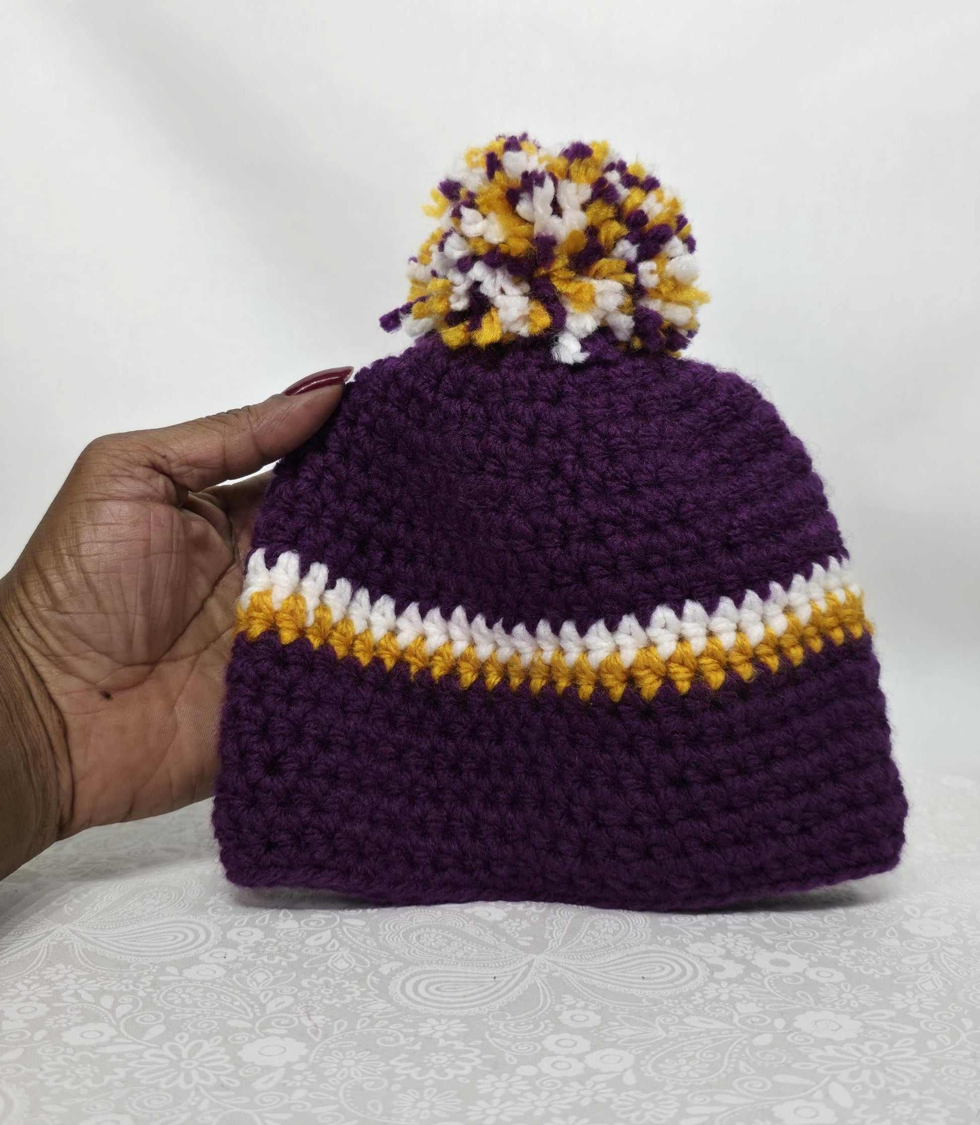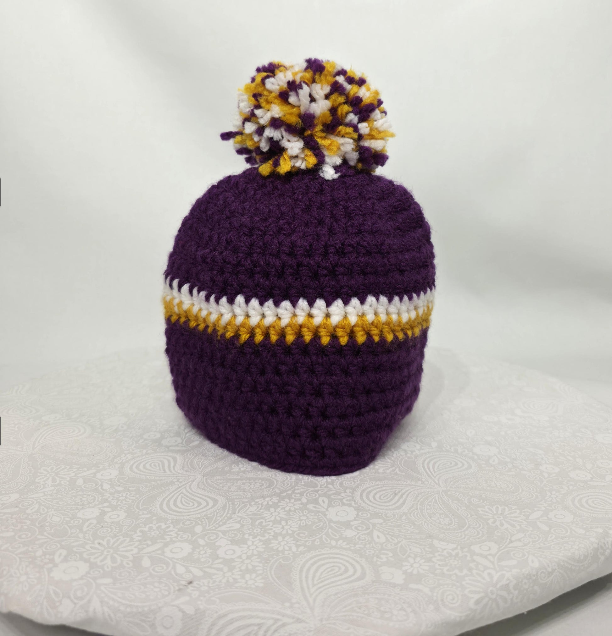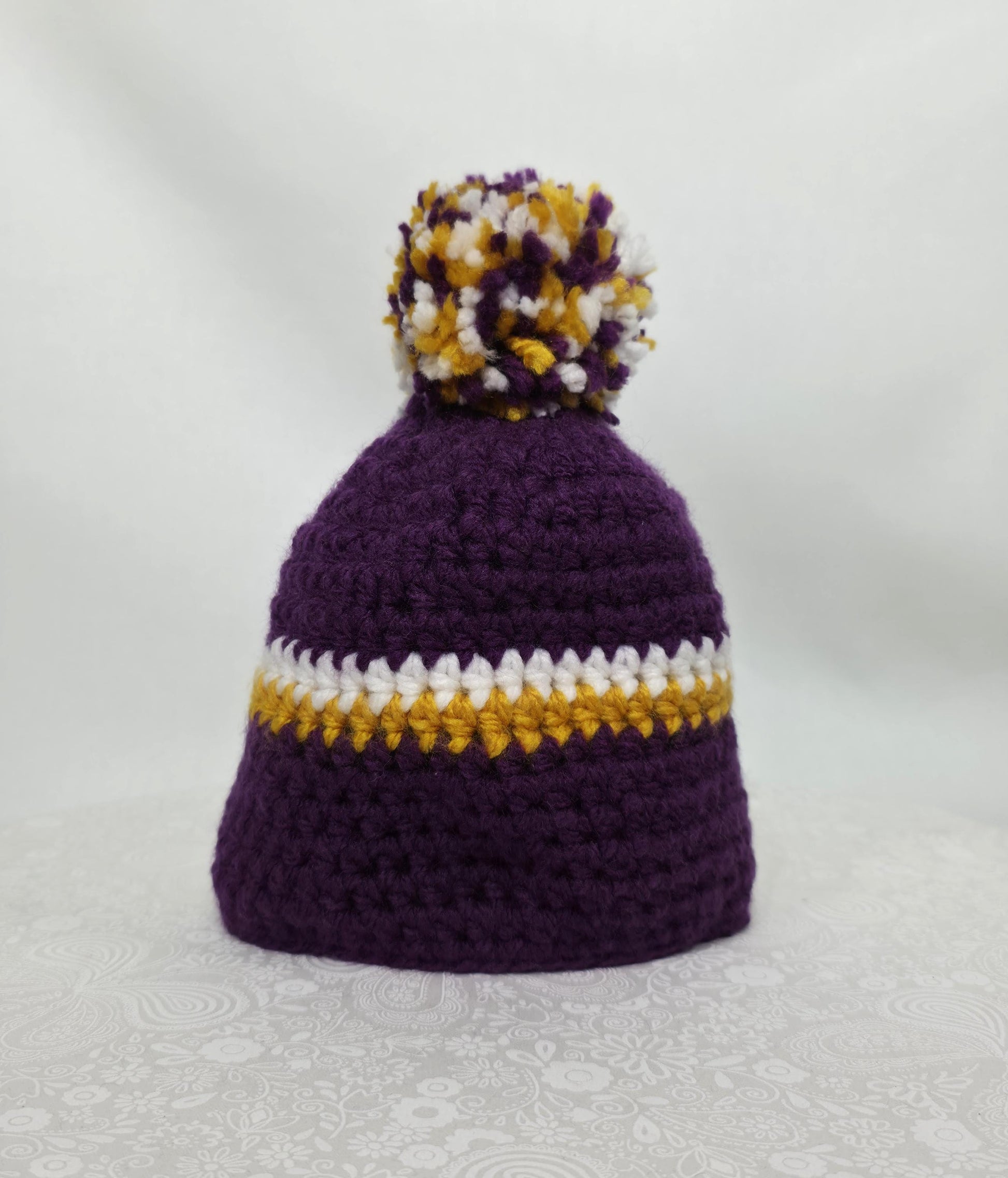 MN Vikings Inspired Crochet Beanie With A Pom, Size 6-9 Months, Made From 100% Acrylic Yarn