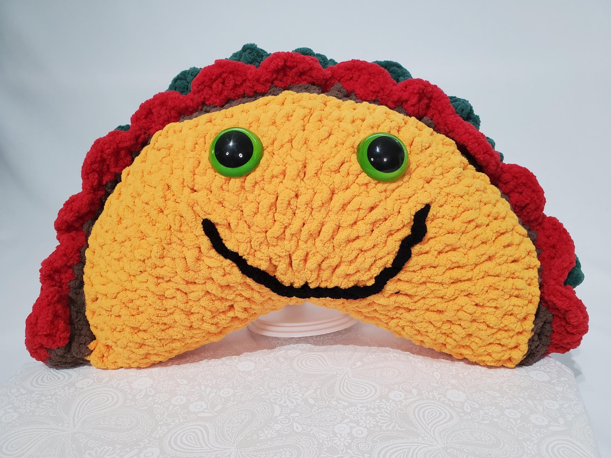 Crochet Taco Stuffie / Plush Toy, made with soft blanket yarn and plastic safety eyes. Approx. 15"x10"x6"