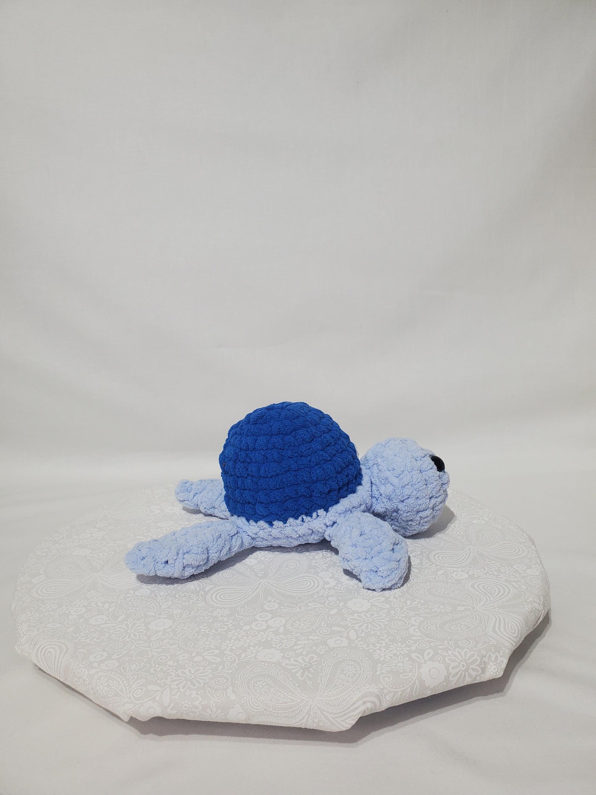 T20: Crochet Turtle Plushy / Stuffy, blue, made with soft blanket yarn (100% Polyester) and safety eyes, approx. 10" x 5" x 10"