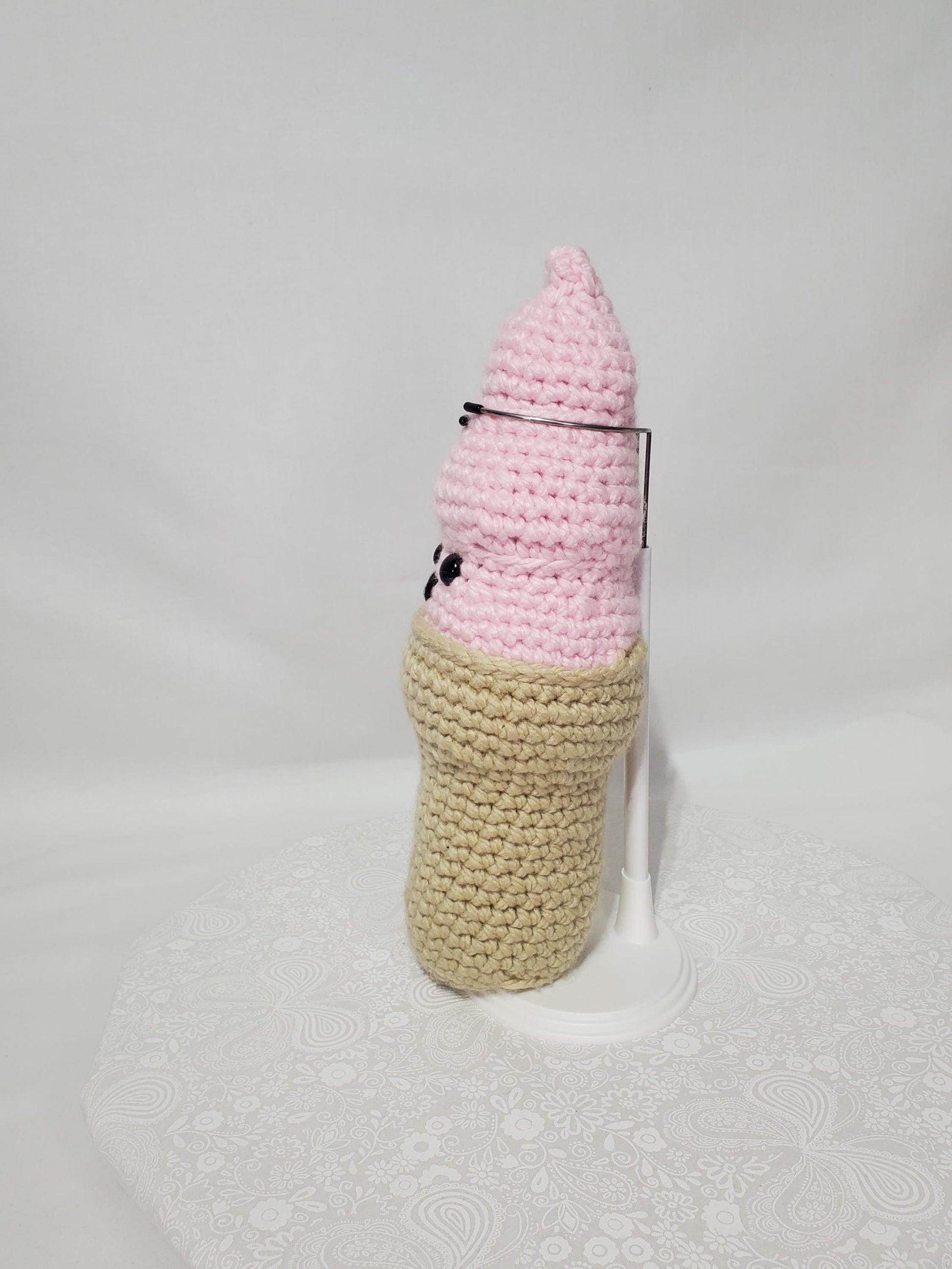 Crochet Swirl Ice Cream Cone, made with 100% acrylic yarn, fiber fill, and plastic safety eyes, approx. 11" x 5"