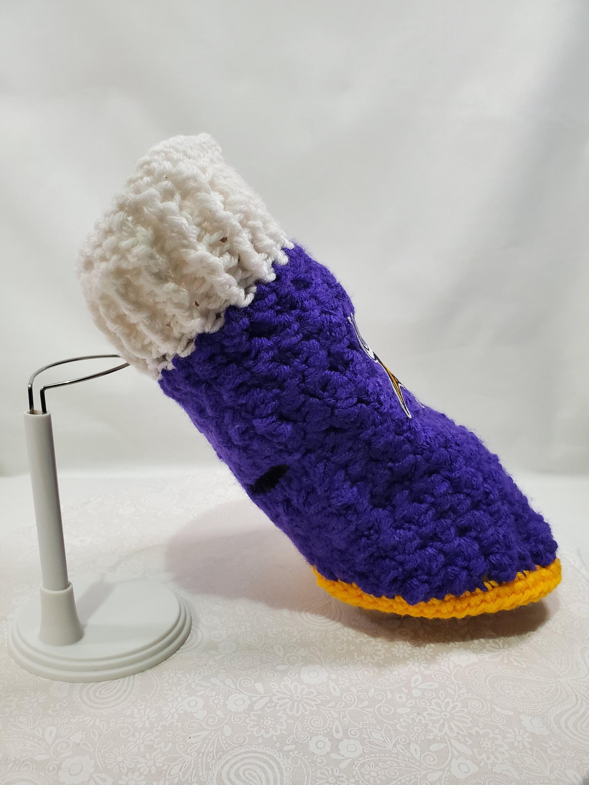 MN Vikings Inspired Dog Sweater for a very small dog, made with 100% Acrylic Yarn. Approx. Neck: 10", Chest: 12", Neck to tail (back): 12 1/2"